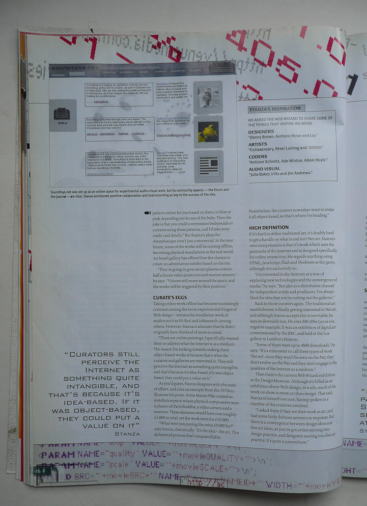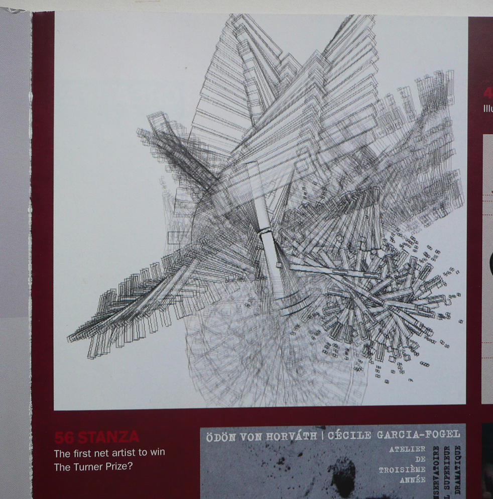 Generative paintings made with computer code. The artworks develop the languages and forms of modern abstraction though new digital technologies. (You will need the shockwave plug-in to experience this work online). This work is formally different from my main artwork in that that my objective has always been to extend the notion of what painting is. Using computer code various paradigms emerge that allows me to shape and construct the visual aesthetic. I am not so much interested in the code as the manipulation of form. Click here to see a dedicated video channel of these works instead. Click here to read paper published on Amorphoscapes circa. 2001 About Amorphoscapes. Audio visual relationships between art and science....maybe. Paper First published at COSIGN-2002, 02 – 04 September 2002, University of Augsburg, Lehrstuhl f ü r Multimedia-Konzepte und Anwendungen, Germany ...[download information sheet... pdf info] Amorphoscapes by Stanza are interactive, generative, audio visual, digital paintings and drawings created specifically for the internet. This is interactive art on the internet, incorporating generative sounds and 3D imaging. Amorphoscapes, provide a seductive, multi-sensory non-linear and interactive experience for the audience to immerse into. Cellular forms replicate, intricate webs evolve, moods and colours change and fuse, sounds and rhythms pulse and change. Amorphoscapes allow the "user" to experience each artwork differently, depending on how they choose to navigate. As well as providing this non-linearity, some of the pieces change over time, ie they generate. The "user" controls these evolving pieces through movement. The character of the resulting piece is unique to the user. This change in the relationship between the 'user' and the artist changes the perception of the artwork. The user can choose what they experience. At any time the user can make subtle or total change to their Amorphoscape whenever they want to explore further. Or simply watch the piece change itself, in a generative way. Amorphoscapes are audio visual paintings, and can be installed into 'real' environments, where the movement of people in the room or gallery triggers the interactivity within the work. They could be thought of as drawing and paintings machines, in the future to be projected, onto buildings, on clothes and on cars, and on large plasma screens in your living room. AMORPHOSCAPES: AUDIOVISUAL SYNTHESIS, A NEW KIND OF PAINTING Amorphoscapes are a new type of image and a new type of painting. A definition could be; "a self contained online image experience". They react to users and are in turn influenced by the users movement. These paintings are generated, they use programming languages, and incorporate manipulated images using software to create them. These works are an audio-visual synthesis. Its not about sound at the expense of the visual element. My work is about the marriage and synthesis of the audio visual potential exploring the internet as a medium in its own right. To engage with my online work the user must participate in a number of ways, not only as a passive observer but also as an active 'user'. The user is directly related to the shifting audio visual language that moves only when the user moves and shifts with the works. The choices are made by the user, but clearly the aesthetics are defined by me, the artist. The use of specific types of sounds, colours, patterns and lines are all defined parameters within each work. But in the new online works in my 'Amorphoscapes' series, the user can move these lines and colours in a constantly shifting changing audio visual experience. So now, where once the viewpoint was fixed and static, the parameters are allowed to be changed, These artworks have become mostly non-linear and multi- layered. The visitor to such an experience is paramount to the understanding and meaning of the artwork. Only by engaging with the work will he understand that he himself essentially determines what he will see. This it could be said has become true of all artwork, but within the interactive works, each user thus creates their own artwork, and more importantly the artwork becomes increasingly co-dependent on the user and their input or interaction. Amorphoscapes as digital paintings inhabit the worlds of art, music and design. As artworks, they are an extension to the modernist grid; except now the grid is multiplying and shifting. Moving into another dimension of multi user input both from the audio and the visual. I like the idea that these works embrace the art of drawing and painting; in fact they act as autonomous drawing and painting machines. Each online installation is an experimental attempt to make an interface which is interesting to look at and expressive booth audibly and visually. So the new interactive works are variable, and with my "Amorphoscapes" series, they also allow you to do it online, globally, in real time as internet specific artworks. i.e. this is net art. It is interesting to set up some limitations for the internet; it helps understand where the net and net art is at the moment. The amorphoscapes are quite small in file size, usually up to 100k sometimes 200k if there are lots of sounds. Its means the user can actively engage with the work, quickly and in real time. Because of this, design plays an important part in the overall aesthetic. Big graphics and large sounds files are avoided, to aid consumption via download, because of bandwidth. The entrance to the gallery is a 56 k modems, so I respect the audience by not putting up large downloads. So the cube is the gallery, but the internet can also be extended outside the cube into the real space. I recently set up a series of satellite links from my websites, the central city, and some of the Amorphoscapes series. I took my laptop into strange spaces to move the internet into the real world. Certain works were then changing over the net, and inside the corrid